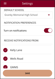 - In the GPS app, choose Settings from the main screen. Turn on Notifications and check off the sites you would like to receive notifications from (scroll to see all schools). You can also change your default school from this screen. Save